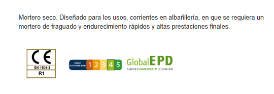 Mortero con etiqueta ecológica tipo III (la más exigente) Declaración Ambiental de Producto verificada externamente por AENOR.