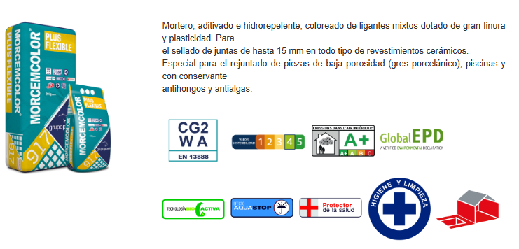 MORCEMCOLOR PLUS FLEXIBLE se produce siguiendo nuestros procedimientos y controles, que son conformes a la Directiva sobre Productos de la Construcción 89/106/CE, según UNEEN: 13888, no estando sujeto al Reglamento Europeo de Productos de Construcción Nº 305/2011 al no tener la norma UNE-EN:13888 anexo ZA, por lo que no precisa de marcado CE ni Declaración de Prestaciones para su comercialización.
