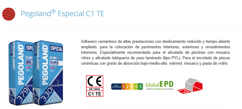 | PEGOLAND ESPECIAL BLANCO Nº: 120025-131 EN-12004:2007+A1:2012 Adhesivo cementoso de fraguado normal, con gradual reducido y tiempo abierto ampliado, para pavimentos y revestimientos interiores, y pavimentos exteriores. |